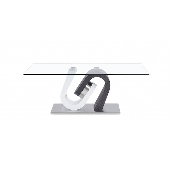 Give your living room, family room, or office the perfect anchor piece with this 48-inch clear, gray, and white glass and steel mod coffee table. A unique abstract design gray and white steel frame is finished off with a clear glass top that is the epitome of quality construction and design. This contemporary rectangular table will be a great accent in living room, bedroom, or office. 17-inch H x 48-inch W x 28-inch D