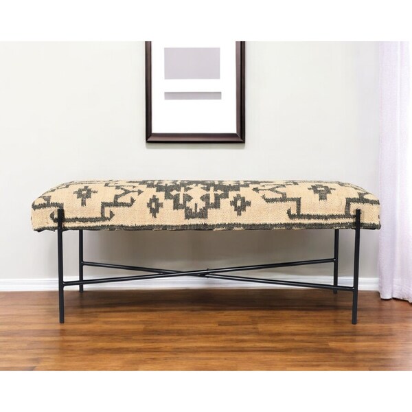 Distinctive in style the 48-inch cream and black cotton blend upholstered southwest bench radiates a versatile charm. A black metal frame is finished off with a cream upholstery seat that is the epitome of quality construction and design. Expertly upholstered with padding and soft cotton blend in a southwest pattern, this bench is as comfortable as it is good looking. Ideal for entrance foyer, hallway, or laundry room. This bench is a great place store your keys, put on your shoes, or be a catchall on your way in or out. Easy to blend into most any room, a bench is a way to add a good looking accent to your space that can also be practical and useful. 18-inch h x 48-inch w x 16-inch d.