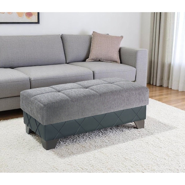 Optimize your space and add some charm to your room with the 48-inch gray and brown chenille and faux leather tufted storage ottoman. Designed to discretely add hidden storage to your room without sacrificing seating or foot rest space. Expertly upholstered with padding in a soft solid color chenille and faux leather, this ottoman is as comfortable as it is good looking. Ottomans are multi-functional additions to your space that add fashion and practical value. 17-inch h x 48-inch w x 24-inch d.