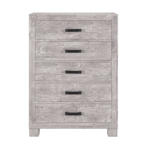 Add personality to your bedroom style and a feeling of coziness with this 48-inch gray wood five drawer dresser. This vertical standard dresser has a convenient and wide top area for your getting ready needs and supplies. Equipped with five easy open drawers for practical and good looking clothing storage. The gray coloration of this piece is neutral and will blend easily with most any decor. 33.19-inch h x 47.68-inch w x 16.73-inch d.
