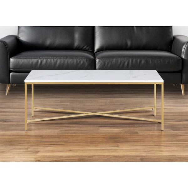 Add handsome, fashionable design to your living space with this 48-inch white and gold steel coffee table. The base of this table is made from steel in a gold color that creates a good looking visual contrast to the white manufactured wood tabletop. This rectangular table is an classic yet updated way to accent your room. If you're looking for something that can fit into a living area, bedroom, or office, this coffee table is for you. This coffee table is the sturdy, reliable and stylish answer to your living room needs. 18-inch H x 47.63-inch W x 23.75-inch D