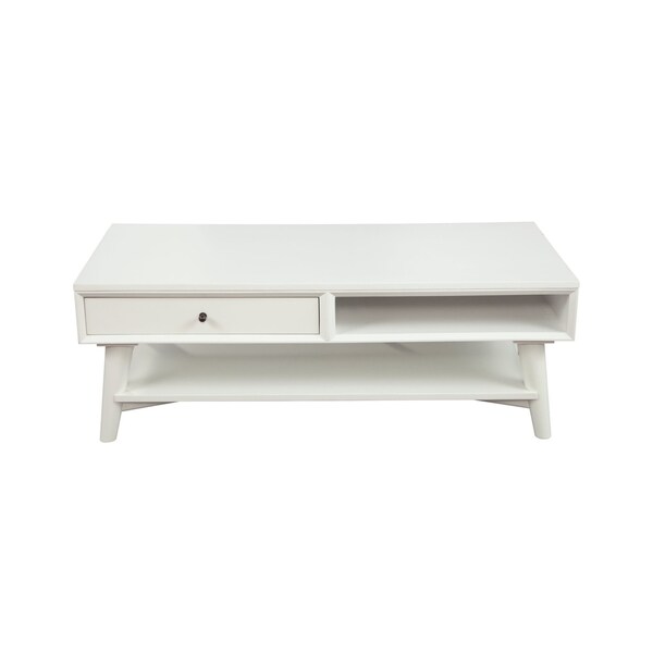 Make your living room or family room really stand out with this 48-inch white solid and manufactured wood coffee table with drawer. A white coloration runs throughout this good looking solid and manufactured wood and solid manufactured wood table. This rectangular table is an classic yet updated way to accent your room. It has a fresh design that will definitely breathe some fresh air into your interior. This coffee table is the sturdy, reliable and stylish answer to your living room needs. 17.5-inch H x 48-inch W x 22-inch D