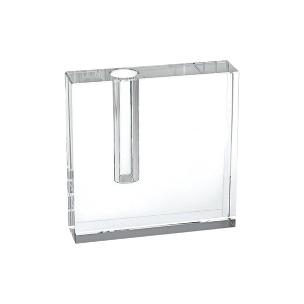 Add a touch of elegance to your space with this contemporary 5-inch clear lead free crystal bud vase. Crafted from high-quality mouth blown, lead-free crystal, this uniquely shaped block shape that is a piece of art unto itself, but also great for showcasing your favorite bloom in contemporary style. Elevate your home decor with this sophisticated piece that exudes modern charm and timeless beauty. 5-inch h x 1-inch w x 5-inch d.