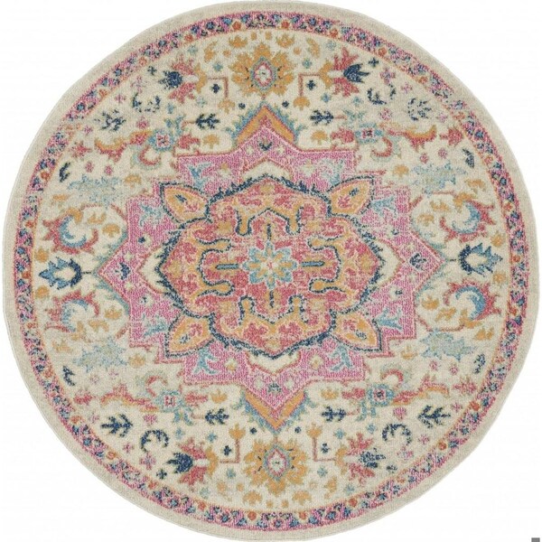 5 ft. Round Ivory & Pink Medallion Area Rug