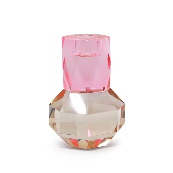 This 5-inch pink and clear crystal tabletop taper candlestick is a great addition to your home decor and sure to complement your existing furniture. Dress up your home to impress every season with this fabulous candleholder. Features a modern and contemporary optical crystal layered short stack geometric block design in a chic clear and pink color combination 4.75-inch h x 3-inch w x 3-inch d.