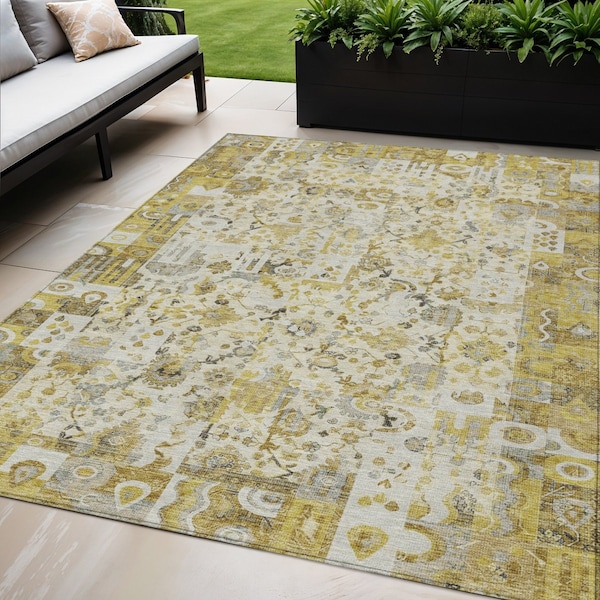 This 5-foot x 8-foot gold and ivory patchwork washable indoor outdoor area rug, is a great way to add warmth to a room. This rectangle shaped rug features a patchwork design that will work well both indoors or out. A classic shape marries with good looking design for your living room, hall, bedroom, porch, patio, or poolside. Ideal for outdoor spaces or high traffic areas with kids and pets, this rug is made from heavy duty polyester that is stain resistant to help repel water, dirt, and stains. Makes a great way to dress up your patio, porch, or poolside, but also works well as a durable and easy to maintain option in the kitchen, family room, or mudroom. 60-inch h x 90-inch w x 0.19-inch d.