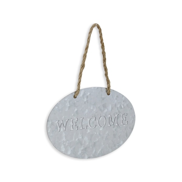 Add an air of fashion to your room and rejuvenate the space with this 5-inch x 8-inch gray handcrafted welcome galvanized metal wall decor. This rustic and crafty Welcome sign includes a rope for easy hanging. Hang on your wall to add some up to date fashion and decoration. 5.25-inch H x 7.75-inch W x 0.5-inch D