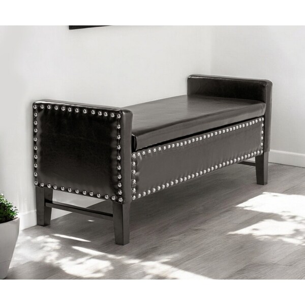 Practicality and fashion mix together with this handy 50-inch espresso upholstered pu leather bench with flip top. A espresso coloration runs throughout this good looking solid wood and upholstery bench. Expertly upholstered with padding in a soft solid color pu leather, this bench is as comfortable as it is good looking. A convenient flip top gives this bench multi-functionality to house hidden storage to help keep your space neat and tidy. Arms anchor this bench on either side for your comfort stability. Adding this bench to the end of your bed is a great idea to help you get ready in the morning. Benches don't have to be unsightly. Increase your seating and the fashion quotient of your room all at the same time with this hard wearing, versatile, and good looking bench. 22.05-inch H x 50-inch W x 19.69-inch D