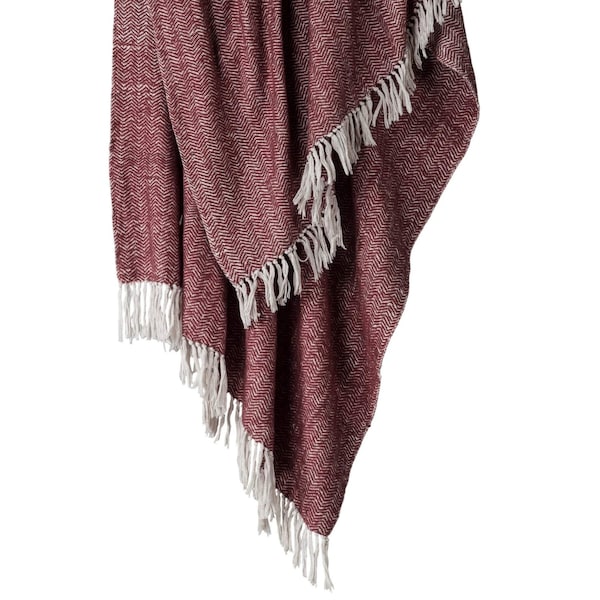 This 50-inch x 60-inch brick red and white chevron cotton throw blanket with fringe is the perfect accent you've been searching for. Handtied by true artisans, this good looking throw will elevate its surroundings with its genuine and artisanal style. Features a woven chevron design that offers sumptuous softness and texture that you'll cherish for years to come. Made from cotton this blanket will make a great addition to any room it's added to. Layering your furnishings with a decorative throw has the ability to awaken a tired living room or elevate the design of your bedroom simply by providing elements of color and texture that weren't there before. Perfect for your favorite chair, bed or lounging on the couch, this blanket helps bring a warm and fashionable flair to your space. 50.00-inch h x 60.00-inch w x 0.20-inch d.