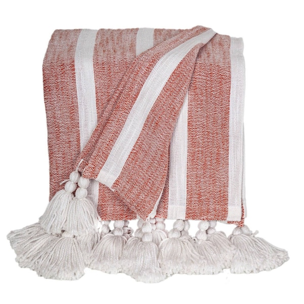 Bring warmth, comfort and style to your space with this 50-inch x 60-inch rust woven cotton striped throw blanket with tassels. Features a woven striped design that offers sumptuous softness and texture that you'll cherish for years to come. Made from cotton this blanket will make a great addition to any room it's added to. Layering your furnishings with a decorative throw has the ability to awaken a tired living room or elevate the design of your bedroom simply by providing elements of color and texture that weren't there before. This cozy throw blanket makes the perfect add-on to movie nights and lazy afternoons. 50-inch H x 60-inch W x 0.5-inch D