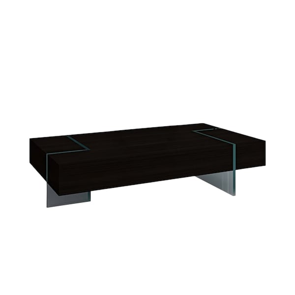 Make your living room or family room really stand out with this 53-inch black and clear wood and glass sled coffee table. Quality construction from the clear tempered glass base combines with black lacquered finish manufactured wood of the top to give this table a fresh and updated look. This contemporary rectangular table will be a great accent in any room if you're looking for something that can fit into a living area, bedroom, or office, this coffee table is for you. This coffee table is the sturdy, reliable and stylish answer to your living room needs. 12-inch h x 53-inch w x 28-inch d.