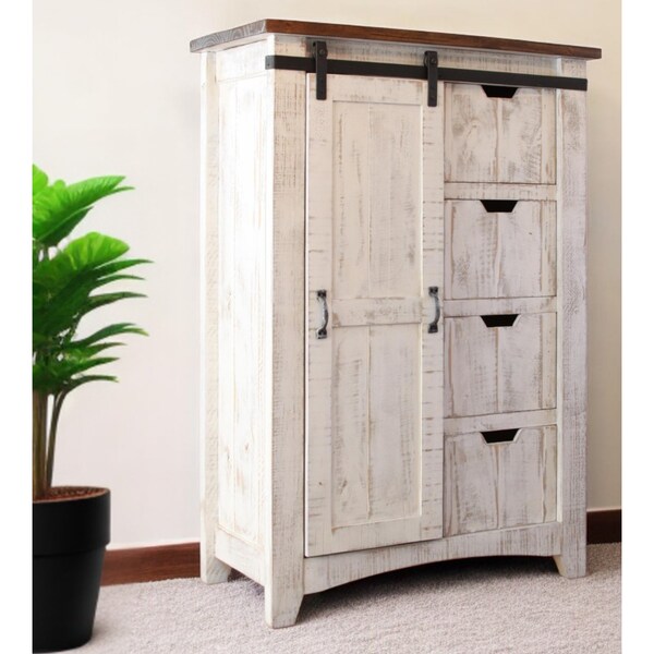 Add personality to your bedroom style and a feeling of coziness with this 54-inch brown and white solid wood four drawer combo dresser. Versatile in use, this combo dresser is equipped with both drawers and doors for all your storage needs. Equipped with four easy open drawers for practical and good looking clothing storage. This dresser is built to last from high quality solid wood, the brown and white coloration of this piece is neutral and will blend easily with most any decor. 53.5-inch h x 36.5-inch w x 18-inch d.