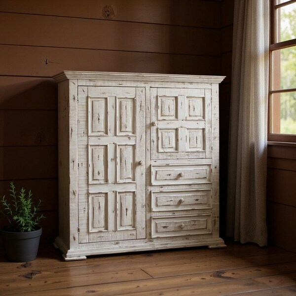 This 55" white solid wood three drawer gentlemans chest is a practical and good looking accent for your bedroom storage and organizational needs. The space saving design of this gentlemans chest makes it a great choice for space challenged spaces or small walls within your room. Equipped with three easy open drawers for practical and good looking clothing storage. This dresser is built to last from high quality solid wood, The white coloration of this piece is neutral and will blend easily with most any decor. 60.75" H x 55" W x 22.75" D