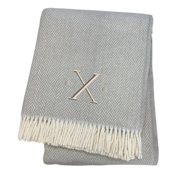 55" X 70" Gray White Herringbone Cotton Blend X Initial Throw Blanket with Tassels Embroidery