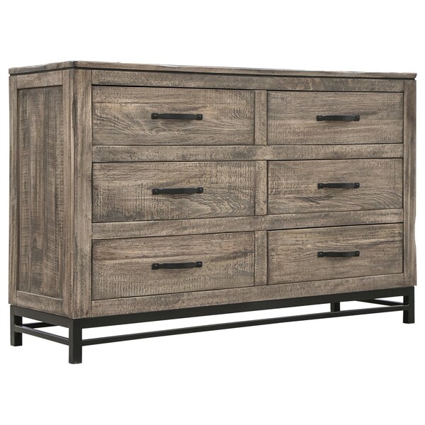 Add personality to your bedroom style and a feeling of coziness with this 56" brown solid wood six drawer double dresser. This horizontal double dresser has column style drawers and a wide top surface area to help you with your daily dressing essentials. Loaded with capacity, this piece is equipped with six easy open drawers for practical and good looking clothing storage. This dresser is built to last from high quality solid wood,. 32.5" H x 56" W x 17.75" D