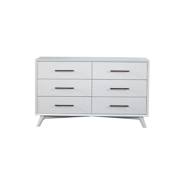 This 56" white solid wood six drawer double dresser is a practical and good looking accent for your bedroom storage and organizational needs. Designed for you to stand in front of and get ready, this horizontal double dresser has a convenient and wide top area for your getting ready needs and supplies. Loaded with capacity, this piece is equipped with six easy open drawers for practical and good looking clothing storage. This dresser is built to last from high quality solid wood, The white coloration of this piece is neutral and will blend easily with most any decor. 34" H x 56" W x 18" D