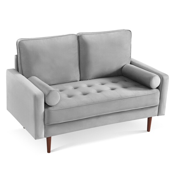 Designed for comfort and good looks, this 57-inch gray and dark brown velvet loveseat and toss pillows is a great option to anchor your space. Track arms offer a comfy place to rest and give this piece some interest and shape. The tufted cushions add visual interest and fine designer detailing. Dark brown solid wood legs effortlessly elevate the room and add a touch of contemporary design. A great showpiece for your room, this sofa is a must have. 37-inch H x 57-inch W x 32-inch D