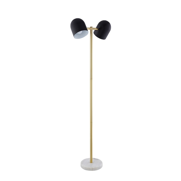 Bring of level of elegance and charm to your space with this good looking 58" black and gold two light floor lamp with black bell shade. The base of this lamp is made of metal finished in a white tone. The white coloring adds a delightfully neutral tone to your home and matches with most any decor. The white of this lamp creates a nice contrast with the black metal bell shaped shade. Designed to be unique and visually pleasing while giving great light, this novelty lamp will bring some fun fashion and style to your space High quality design makes this a great lamp for not only lighting, but accenting a room with style. The perfect lamp to create just the right natural and soothing light in your space. 58" H x 18" W x 18" D