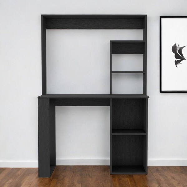 This 58-inch black wood computer desk with hutch will help to turn your office space into an executive suite. Designed to easily fit into most spaces, this classically shaped rectangular desk will turn your room into a productive workspace. Built to last, this sturdy desk is designed for comfort and efficiency for years to come. 17.72-inch h x 58.35-inch w x 38.78-inch d.