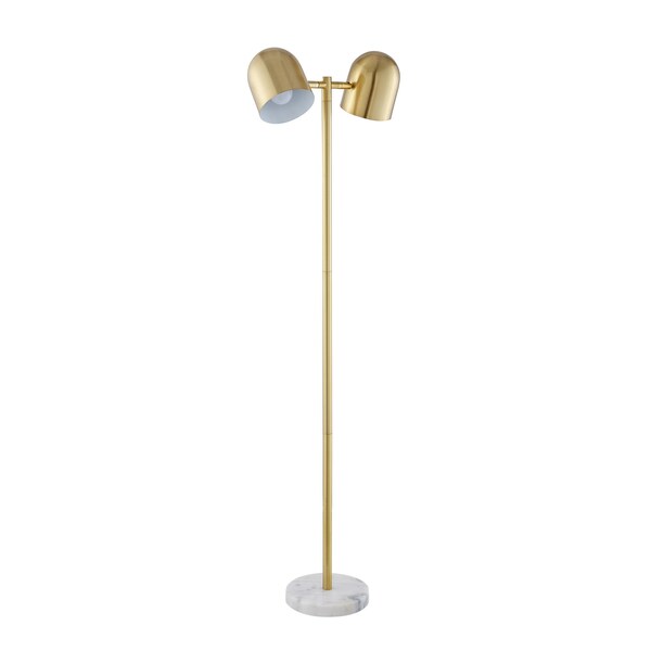 With this 58-inch gold and white two light floor lamp with brass bell shades you bring design along with some warm ambient lighting to your space. A gorgeous gold and white metal and marble base bring just the right amount of pizzazz to this fabulous lamp. The lamp shade itself has a bell shape and is made of metal, which makes it a perfect choice. Classically styled, this traditional lamp features a straight pole that extends upwards from a single base. Use this lamp anywhere and elevate the look of the whole space. The perfect lamp to create just the right natural and soothing light in your space. 58-inch H x 18-inch W x 18-inch D