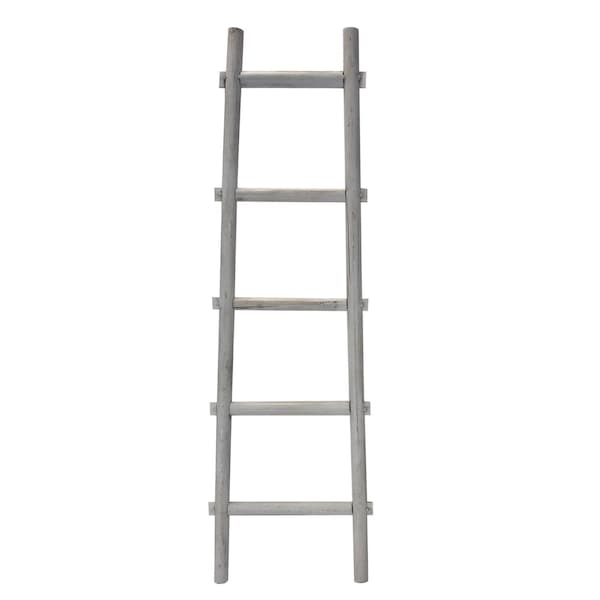 Elevate your living room decor with the 59-inch gray five step rustic weathered grey wood ladder shelf. Crafted from wood with purposeful distressing, this decorative piece brings a rustic charm to any space. The weathered grey color adds a touch of elegance and versatility, perfect to hold your blankets, towels, or other small accessories. Add a cozy atmosphere to your home with this charming rustic ladder, a perfect addition to your living room, bedroom, or hallway interior design. 59-inch h x 18-inch w x 2-inch d.