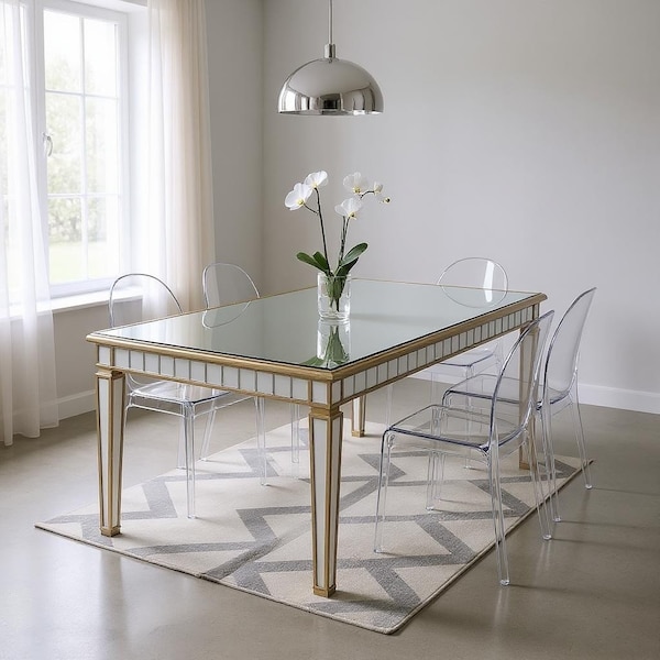 This good looking 33-inch silver and gold mirrored glass and wood mirrored dining table is sure to inspire compliments. This table is made from sturdy manufactured wood and mirrored glass in a striking gold and silver coloration. The mirrored glass tabletop surface and legs accented with gold give this piece a sophisticated and stylish look. This table is the sturdy, reliable and stylish answer to your dining room needs. This eye-catching dining table is ready for you to enjoy breakfast for one or entertain your guests. 29.92-inch h x 59-inch w x 33.46-inch d.