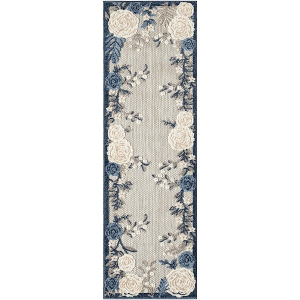 Set an inviting tone in your space with this 6-foot blue and gray floral indoor outdoor runner rug. This runner shaped rug features a floral design that will work well both indoors or out. A classic shape marries with good looking design for your living room, hall, bedroom, porch, patio, or poolside. Ideal for outdoor spaces or high traffic areas with kids and pets, this rug is made from heavy duty polypropylene that is stain resistant to help repel water, dirt, and stains. Makes a great way to dress up your patio, porch, or poolside, but also works well as a durable and easy to maintain option in the kitchen, family room, or mudroom. 24-inch h x 72-inch w x 0.25-inch d.