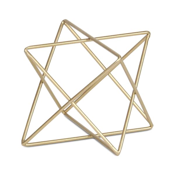 The 6-inch gold metal open geometric tabletop sculpture is the perfect decorative accessory for your home. A perfect decorative addition for anyone who loves a stylish look and feel. Designed with a contemporary flair, this masterpiece showcases unique 8 point, star like open geometric shape that will captivate any viewer. Crafted from durable metal, it exudes a modern aesthetic perfect for elevating your home decor. The handmade quality ensures that each piece is one-of-a-kind, adding a personal touch to your surroundings. Ideal for tabletops, this sculpture makes a striking statement while bringing sophistication to any interior. 5.5-inch h x 8-inch w x 8-inch d.