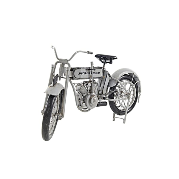 This hand-painted sculpture of a model motorcycle showcases exquisite craftsmanship and quality. Each detail carefully crafted in high-grade metal, adding a touch of sophistication to any living room decor. Its contemporary style effortlessly blends with existing decorations, making it a versatile piece for styling corners or shelves. The subject of transportation adds a dynamic element to the room, creating visual interest and conversation starters. Perfect to display on its own or paired with complementary accents for an elevated look that exudes elegance and charm. 6-inch h x 12-inch w x 3.5-inch d
