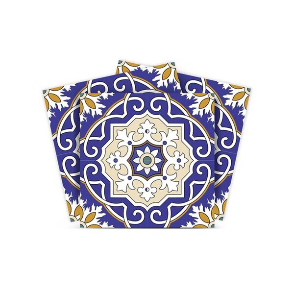Easily add in gorgeous color and interest to your space with these 6" x 6" Blue White and Gold Mosaic Peel and Stick Removable Tile stickers. These fabulous peel and stick tiles will add lots of color, sophisticated flair, and fun design to your kitchen backsplash, fireplace mantel, stair treads, half wall, bathroom or nook. These 6" square tile stickers in multiple bright fun colors and designs are an easy, no mess solution to complete a personalized and colorful room makeover. Easy to apply on any clean dry flat surface, and easy to remove. Multi use and multi-room appeal make this design option is perfect for renters, landlords, college students and homeowners alike. Peel and stick tile decals make it easy to turn your space into a home. Removable without damage to surfaces. One kit contains 24 stickers. Kit includes a single style tile design.
