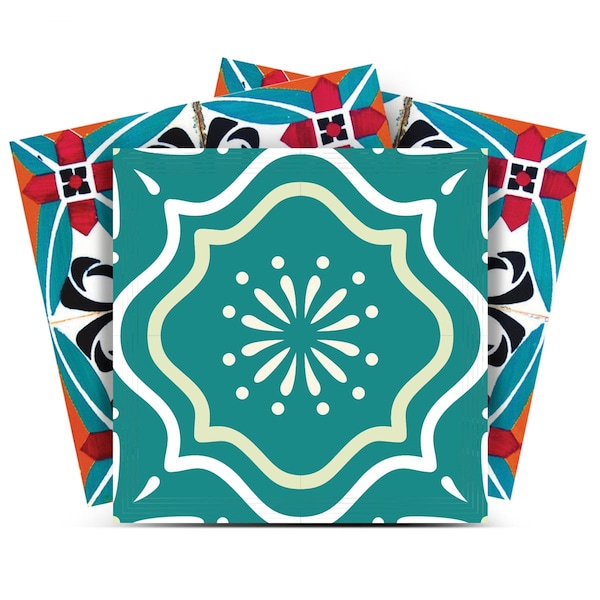 The possibilities are endless with these 6" x 6" Turq and Terra Cotta Scroll Peel and Stick Removable Tile stickers. These fabulous peel and stick tiles will add sophisticated flair and design to your kitchen backsplash, fireplace mantel, stair treads, half wall, bathroom or nook. These 6" square tile stickers are an easy, no mess solution to complete a personalized and colorful room makeover. Easy to apply on any clean dry flat surface, and easy to remove. Multi use and multi-room appeal make this design option is perfect for renters, landlords, college students and homeowners alike. Peel and stick tile decals make it easy to turn your space into a home. Removable without damage to surfaces. One kit contains 24 stickers. Kit includes a two repeating designs.