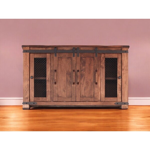 Ready to be enjoyed in your living room, family room, or recreation room, this 60" brown solid wood cabinet enclosed storage distressed tv stand is a practical and good looking piece of furniture that will help to anchor your room. Curated from high quality solid walnut wood, this console is natural, beautiful, and built to last. Due to the genuine nature of the wood some natural wood knots, and grain and color variations may occur. A A cord cut out hole is ideal for wire and cable managment to keep your space looking tidy. Ideal for tv placement and storage in your living room, bedroom or office. 34.75" H x 59.75" W x 17.75" D