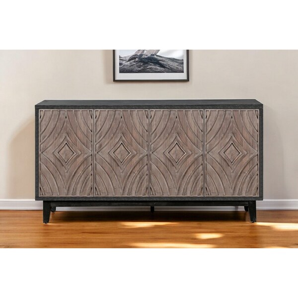Storage vessels don't have to be unsightly. Increase your storage space and the fashion quotient of your room with this hardwearing and versatile sideboard. Crafted from a mix of solid and manufactured wood with distressing, this mid-century style sideboard features a beautiful carved geometric pattern. The charming charcoal gray and brown color scheme adds warmth to any space. This multi-functional practical piece of furniture seamlessly blends functionality with aesthetic appeal. 32.28-inch H x 60-inch W x 15.6-inch D