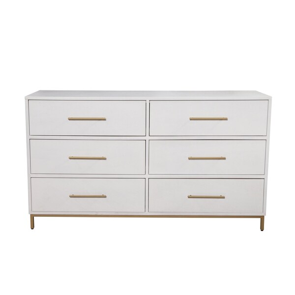 Enhance your room into a visually delightful and highly functional space with this 60" white solid wood six drawer double dresser. Designed for you to stand in front of and get ready, this horizontal double dresser has a convenient and wide top area for your getting ready needs and supplies. Loaded with capacity, this piece is equipped with six easy open drawers for practical and good looking clothing storage. This dresser is built to last from high quality solid wood, The white coloration of this piece is neutral and will blend easily with most any decor. 34" H x 60" W x 18" D