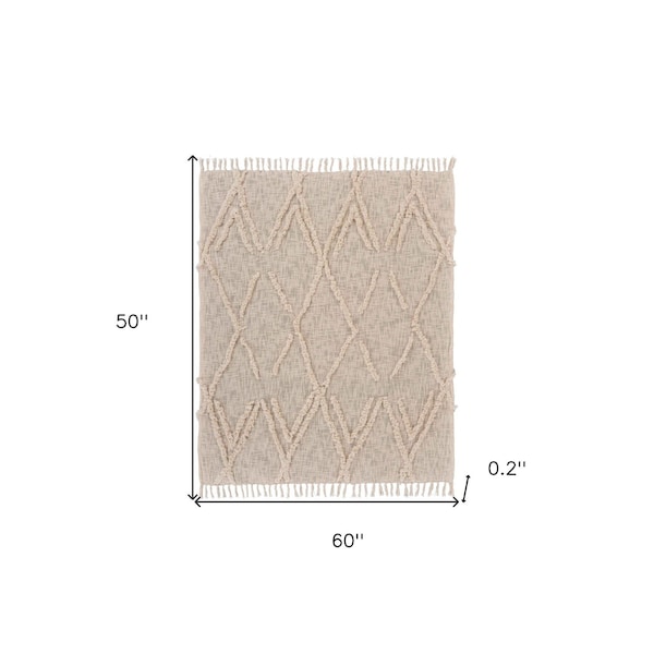 60" X 50" Beige Woven Cotton Geometric Throw Blanket with Fringe