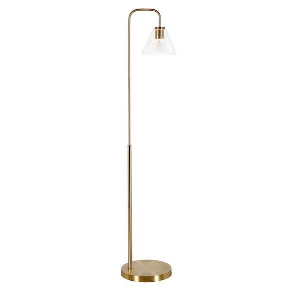 Truly a mix of design and functionality that doesn't compromise on style, this 62" brass arched floor lamp with clear transparent glass cone shade will be a great addition to your space. A gorgeous brass metal base bring just the right amount of pizzazz to this fabulous lamp. The brass base coloring infuses a warm and rich tone to your space. The brass of this lamp creates a nice contrast with the clear glass cone shaped shade. A great way to shed light over those hard to reach areas, this arched floor lamp has a single base with straight pole that extends upwards and a long curving arm. High quality design makes this a great lamp for not only lighting, but accenting a room with style. It is perfect for virtually any decor. 62" H x 12" W x 12" D