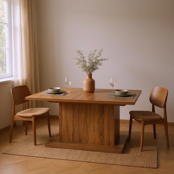 Make a statement with the 63-inch brown wood self-storing leaf pedestal base extendable dining table and infuse a dash of character and personality into your space. You will add an updated and fresh look to your dining space with this walnut brown manufactured wood table that extends to adjust size as needed. A beautiful pedestal base adds some dimension and elegance to your dining. This table is the sturdy, reliable and stylish answer to your dining room needs. The dining table is a symbol for togetherness, special meals, and conversation. 29.5-inch h x 63-inch w x 35.4-inch d.
