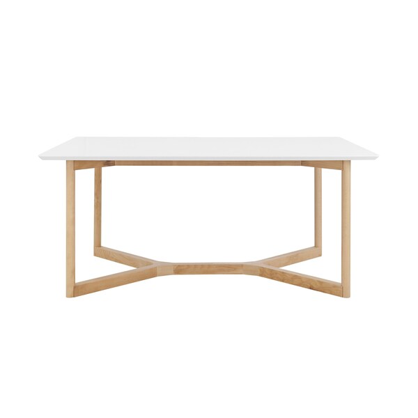This good looking 63-inch white and natural wood frame base dining table is sure to inspire compliments. Quality construction from the natural solid and manufactured wood base combines with white manufactured wood of the top to give this table a fresh and updated two-tone look. Seat up to 6 family and friends around your new dining table. This table is the sturdy, reliable and stylish answer to your dining room needs. The dining table is a symbol for togetherness, special meals, and conversation. This 63-inch white and natural wood frame base dining table is a must-have for your home. 30.00-inch h x 63.00-inch w x 31.50-inch d.