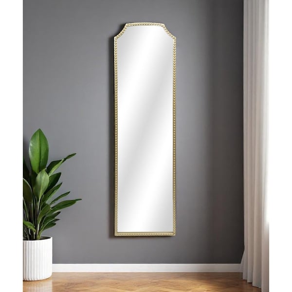 For checking the daily outfit and brightening up the room, this 64-inch gold metal beaded arch full length hanging mirror will be a great addition. Framed with metal in a gold finish, this gorgeous piece also features a beaded border that brings and updated and fresh design to your space. Features quality craftsmanship in every facet that ensures durability and long-lasting wear. Produced with premium quality glass for a beautiful reflection, this mirror will provide an exceptional visual experience. 63.75-inch h x 18.25-inch w x 1-inch d.