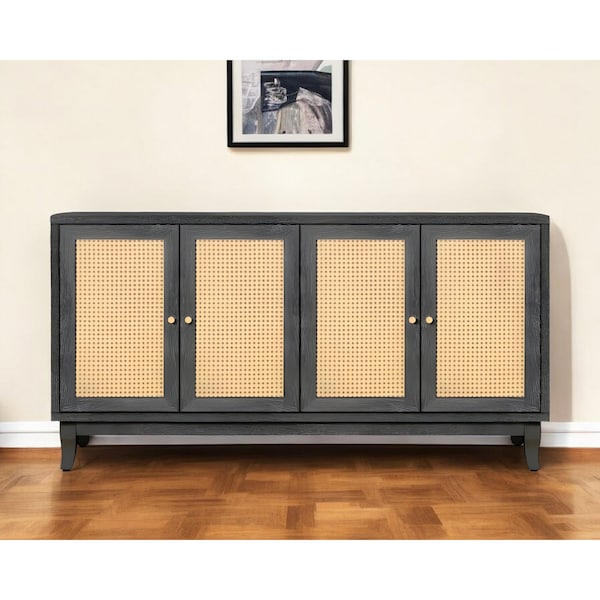 65" Charcoal and Natural Wood and Rattan Sideboard with Four Doors