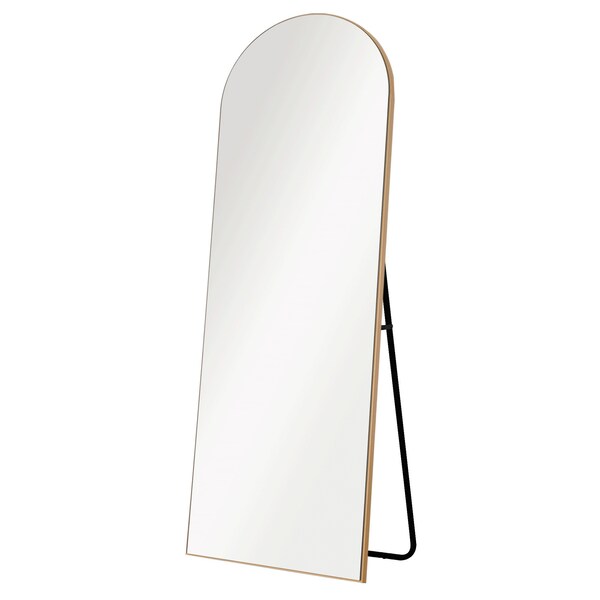 Elevate your space with the luxurious 67-inch gold arch wood framed standing mirror. This freestanding mirror features a shatterproof finish that adds both style and functionality to your home. Its classic arch shape and contemporary design make it a stunning addition to any room, while the gold color brings a touch of elegance. The wood frame complements the mirror's vertical orientation, enhancing the overall visual appeal. With a width of 23 inches from side to side, this mirror is perfect for checking your outfit or adding depth to your living space. Add a touch of sophistication to your decor with this exquisite standing mirror. 67-inch H x 23-inch W x 0.79-inch D