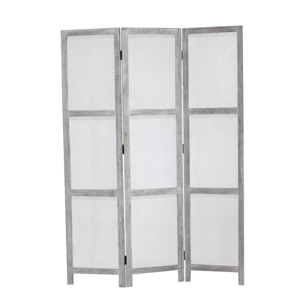 The 67-inch gray folding three panel screen room divider offers a stylish solution for creating privacy in any space. This elegant divider features a sturdy wood frame that adds a touch of sophistication to your home. With three panels, it provides ample coverage while still being easy to maneuver. The folding design allows for convenient storage when not in use, making it versatile for various room layouts. Whether placed in the living room, bedroom, or an office, this room divider enhances the aesthetic appeal while serving its functional purpose. Its gray finish complements a variety of decor styles, ensuring it fits seamlessly into your existing design scheme. Enjoy both form and function with this beautifully crafted divider. 67.00-inch h x 53.00-inch w x 1.00-inch d.