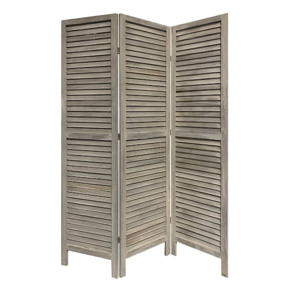 The 67-inch gray folding three panel screen room divider offers a stylish and functional solution for creating private spaces in your home. Crafted from durable wood, this elegant divider brings a touch of sophistication to any room. Its three-panel design allows for versatile placement, making it easy to adjust the layout of your living space. The folding feature provides convenience for storage and mobility, ensuring that you can effortlessly transform your environment as needed. With a sleek gray finish, it seamlessly complements various decor styles while enhancing both aesthetics and functionality. This room divider is perfect for delineating areas without sacrificing light or openness in your home. 67.00-inch h x 48.00-inch w x 1.50-inch d.