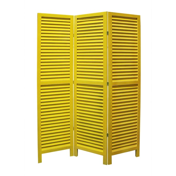 The 67-inch yellow wood folding three panel screen room divider offers a versatile way to create separate spaces in any room. Crafted from durable wood, the frame and screens provide both stability and style. Featuring three panels, this divider allows for flexible arrangements to fit your layout needs. Its vibrant yellow finish adds a pop of color, enhancing your interior decor while serving a practical purpose. This folding design facilitates easy storage when not in use, making it an ideal solution for those with limited space. Perfect for apartments or open-concept homes, this room divider brings a charming touch and functionality to your living area. Enjoy the balance of privacy and openness that it provides throughout your home 67.00-inch h x 48.00-inch w x 1.00-inch d.