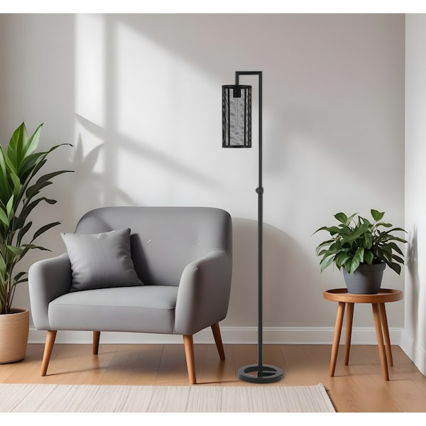 This 69-inch black floor lamp with black mesh metal cylinder shade is the perfect combination of design and function mixed with basic good looks. The base of this lamp is made of metal finished in a black tone and features a circle base at the bottom and then hard angles at the top. The lamp shade has a cylinder shape and is made from metal mesh that is fresh and industrial. Next to your desk or favorite chair this single base task/reading lamp is designed to make your work or activities easier with concentrated light in just the space you need it. 69-inch H x 15-inch W x 10-inch D