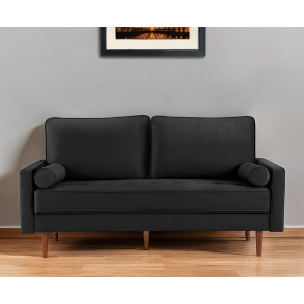 Designed for comfort and good looks, this 69-inch black velvet sofa and toss pillows with dark brown legs is a great option to anchor your space. With a warm and rich look to it, this solid color standard is upholstered in velvet that is designed to be super soft to the touch, sturdy and resilient. Solid colors give you lots of decorative options and are easy to work into your decor scheme. Pocket spring construction gives this piece strong support and makes it comfortable to sit even for long periods of time. Track arms offer a comfy place to rest. The tufted stitching pattern adds visual interest and fine designer detailing. Dark brown solid wood legs effortlessly elevate the room and add a touch of contemporary design. A great showpiece for your room, this sofa is a must have. 37-inch H x 69-inch W x 32-inch D