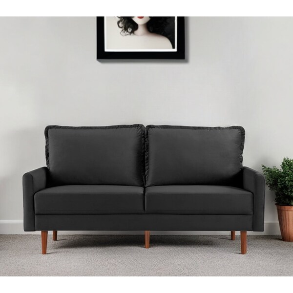 Transform your home's interior with this luxurious 69-inch black velvet sofa with dark brown legs. This solid color standard is made from sturdy and resilient velvet that has a warm and rich look and is a super soft and comfortable to the touch. Solid colors give you lots of decorative options and are easy to work into your decor scheme. Pocket spring construction gives this piece strong support and makes it comfortable to sit even for long periods of time. Track arms offer a comfy place to rest. Dark brown solid wood legs effortlessly elevate the room and add a touch of contemporary design. A great showpiece for your room, this sofa is a must have. 39-inch H x 69-inch W x 32-inch D