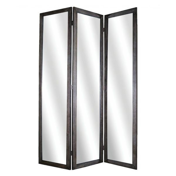 Enhance your living space with this sleek 69-inch black wood and mirrored glass folding three panel screen room divider. Crafted from wood and mirrored glass, this modern style room divider features three panels for added versatility and privacy. The black color adds a touch of chic elegance to any room. Perfect for dividing a room or creating a private nook, this room divider effortlessly combines functionality with style. 69-inch H x 50-inch W x 1-inch D