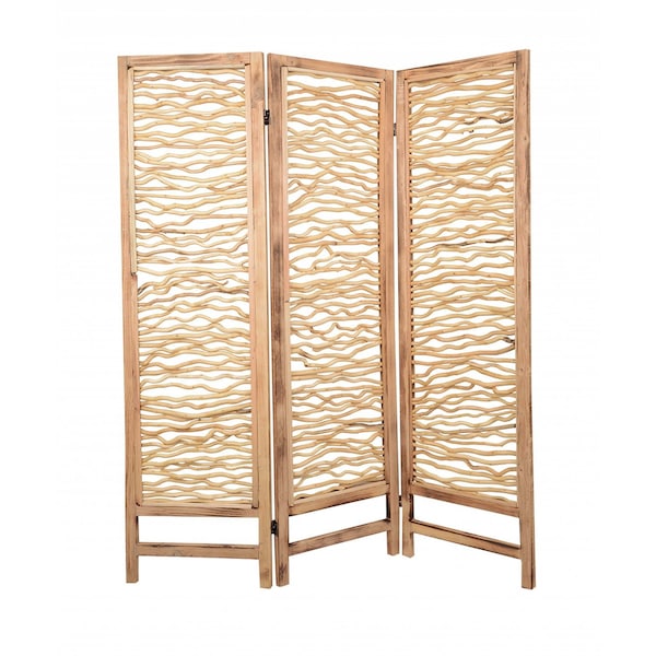 The 69-inch brown wood folding three panel screen room divider is an elegant solution for creating distinct spaces in your home. Crafted from high-quality wood, this room divider blends functionality with a warm aesthetic. Featuring three panels, it allows for versatile layout options that adapt to your needs. The folding design makes it easy to move and store when not in use, providing convenience without sacrificing style. Ideal for adding privacy or defining areas in larger rooms, this piece enhances both decor and practicality. Its rich brown finish complements a variety of interior styles, making it a timeless addition to any living space. Elevate your home's ambiance with this beautiful and functional room divider. 69.00-inch h x 60.00-inch w x 1.00-inch d.