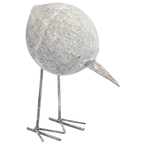 Bring some sizzle to your space with this eye-catching 7-inch off white resin and metal snipe bird tabletop sculpture. This piece is made from resin and has a weathered and distressed off-white finish on it. The textured finish mimics the look of bird feathers. The body of the bird has a solid round shape with eye details and a large beak. Attached to the body there are two thin metal legs that go down in to webbed feet which have the same rustic finish. This pretty bird brings a touch of coastal style and some outdoor beauty to your space. 7-inch h x 6-inch w x 6-inch d.